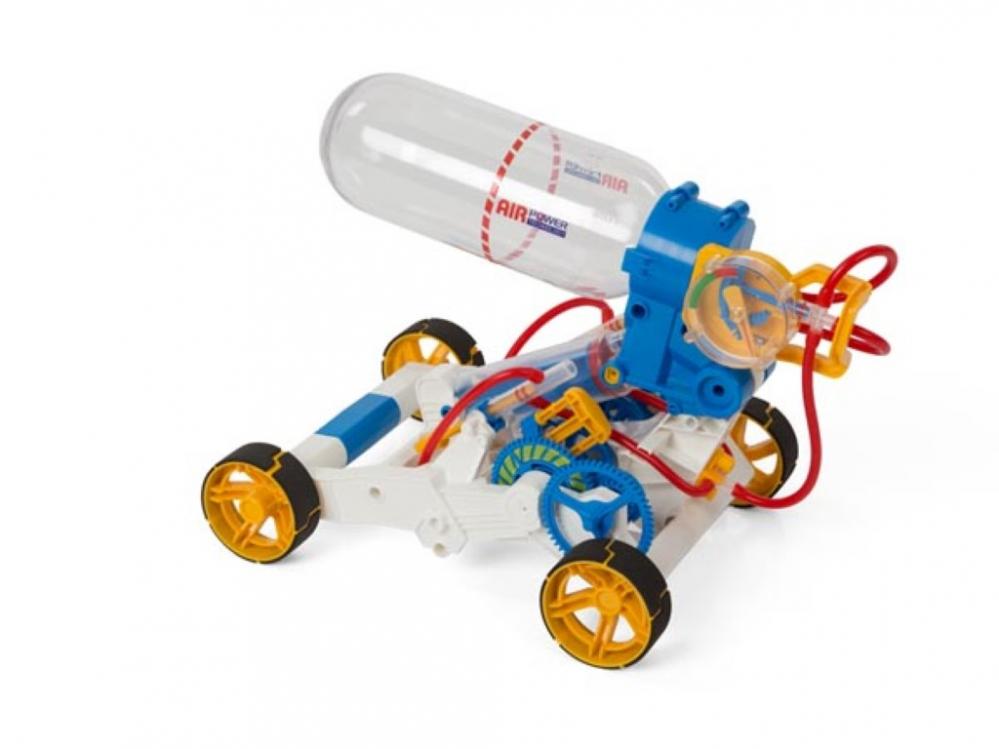 De lucht wordt door middel van een pompbeweging verzameld in de fles en een drukmeter geeft aan wanneer de optimale druk is opgebouwd. Zie hoe de auto nu 50 meter rijdt op lucht. Leert kinderen om gebruik te maken van nieuwe en duurzame vormen van energie.