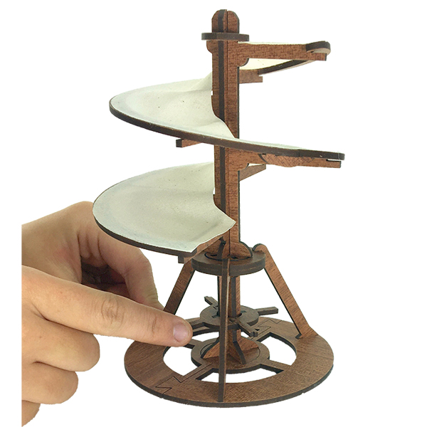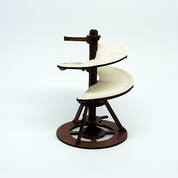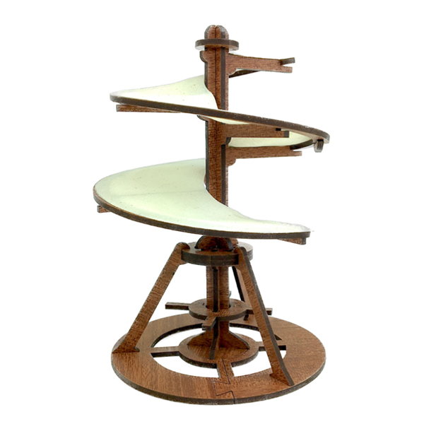 De Luchtschroef is een iconische afbeelding van Leonardo en definieert een kunstenaar en uitvinder die zijn tijd ver vooruit was. Dit werkende model heeft een kap die ronddraait op de steunconstructie, waarmee wordt geïllustreerd hoe Leonardo dacht dat vliegen mogelijk zou kunnen zijn! Een leuk en inspirerend project van een van de grootste geesten uit de geschiedenis!