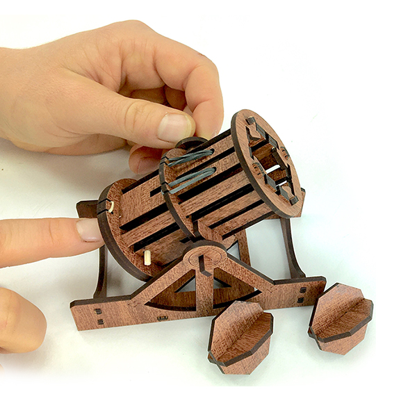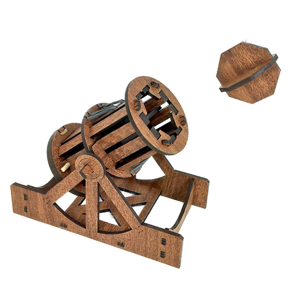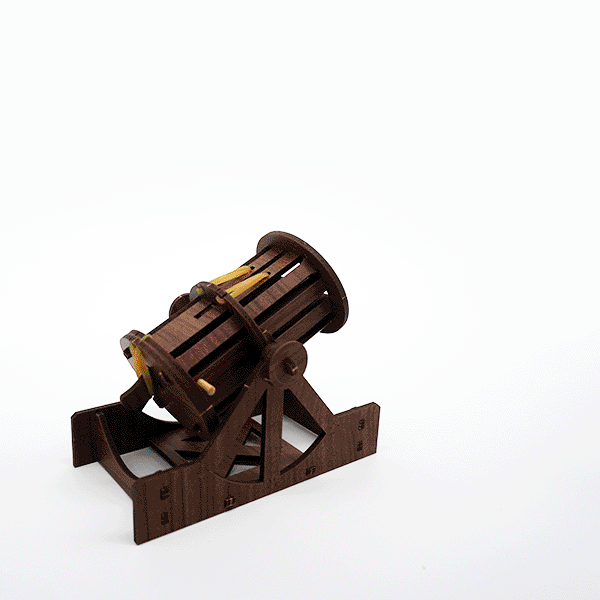 Deze bombardeerset is een replica van een van Leonardo’s iconische afbeeldingen van een kanon en exploderende kanonskogels. Zijn aantekeningen gaven aan dat de holle bommen vlak boven de grond zouden ontploffen en kleine projectielen in alle richtingen zouden slingeren. Best wel luguber eigenlijk, maar in de Renaissance waren er oorlogen – naast de grote kunst – dus dit soort dingen gebeuren. Met deze werkende set kun je kleine projectielen 1,5 tot 3 meter ver afschieten – gaaf!