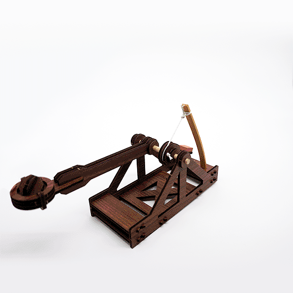 Leonardo da Vinci tekende zoveel afbeeldingen van katapulten dat het moeilijk te bevatten is (en sommige waren erg vreemd!). De meeste gebruikten de kracht die in gebogen hout was opgeslagen als de belangrijkste aandrijving van de projectielen, samen met slingers om de kracht te vergroten. Dit model heeft een stuk bamboe dat buigt en met die kracht de kleine projectielen 1,8 tot 3 meter ver lanceert – geweldig!